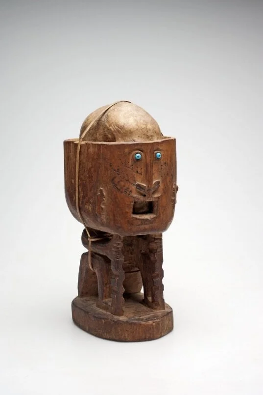 Of high significance are the commemorative statues known as korwar, fashioned by shamanic specialists. These statues were composed as residences for the souls of the deceased and served a priestly function as intermediaries between the living and the dead. Diminutive versions of these statues were crafted to combat illness, to provide personal protection, and employed in auguries and exorcisms. The greatest korwar are skillfully carved and embraced by elaborate latticework. The most superlative, memorable examples of korwar support skulls of vaunted ancestors.